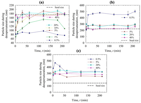 Particle size variation during the seeded desupersaturation when a 20 mL GF-acetone solution was mixed with 1000 mL aqueous solutions of SDS and various polymers: (a) Sol, (b) VA64, and (c) HPMC. Nanoseeds were added to the supersaturated solution at the concentrations reported in Table 2.