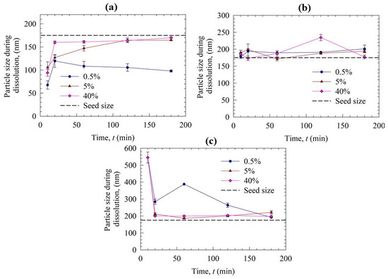 Particle size variation during the dissolution of the ASDs with various polymers: (a) Sol, (b) VA64, and (c) HPMC when various percentages of the nanoseeds were added in the dissolution test.