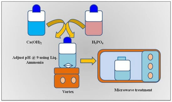 HANPs were synthesized using the microwave-assisted co-precipitation method reported previously []. Briefly, calcium hydroxide [Ca(OH)2] and phosphoric acid (H3PO4) were used as precursors for HANP preparation at a concentration of 1 mM and 90%, respectively. Each solution of H3PO4 and Ca(OH)2 was stirred for two hours. Then, the H3PO4 solution was added dropwise to the Ca(OH)2 solution while stirring. The solution mixture was left undisturbed for 2 h to obtain a precipitate. The precipitate was then washed with distilled water twice, and the pH of the precipitate was adjusted to 9 using liquid ammonia. The solution was dried for 10 min using a microwave oven (20PG3S, IFB, Kolkata, India) (Figure 1). The dried HANP powder was used for X-ray diffraction (XRD: SmartLAB, Rigaku Co., Tokyo, Japan) and transmission electron microscopy studies (TEM, JSM-JEOL, Tokyo, Japan).