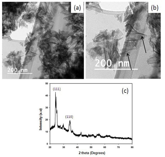 HANPs were synthesized using the microwave-assisted method, as illustrated in Figure 1, by observing precipitation formation. HR-TEM analysis revealed that the synthesized HANPs had a needle-like shape with an average of width of 30 nm and length of 90 (Figure 2a,b). Other studies have reported the synthesis of HANPs from stimulated body fluid and CaP Tris solutions using the precipitation method, wherein the HR-TEM images showed that average particle sizes of the HANPs synthesized from stimulated body fluid and CaP Tris solutions were 90–600 nm and 950–2000 nm, respectively []. The result of the XRD analysis of the synthesized HANPs is shown in Figure 2c. A strong diffraction peak was observed around 2θ values of 25 and 34, corresponding to the orientation plane (111) and (110), respectively. HA synthesized using Klebsiella pneumoniae that could solubilize phosphate showed a similar XRD pattern to that obtained in this study [].