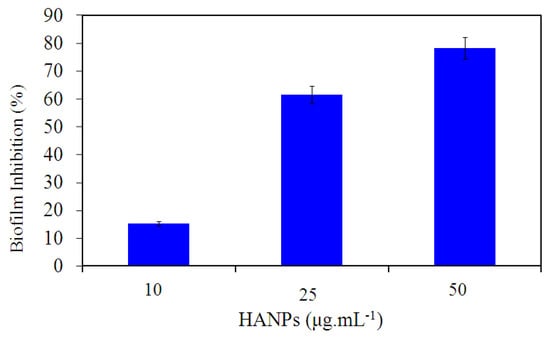 The capability of the HANPs to reduce the risk of P. aeruginosa ATCC 10145 attachment to the surface of the polystyrene microtiter plate was determined using the crystal violet staining method. The HANPs showed dose-dependent biofilm inhibitory activity against P. aeruginosa ATCC 10145. The HANPs showed a maximum of 78.2% antibiofilm activity against P. aeruginosa ATCC 10145 at a concentration of 50 μg mL−1 (Figure 3). In contrast to the negative control, which contains only HA at the higher concentration used in this study (data not shown), HANPs significantly reduced the biofilm formation in P. aeruginosa ATCC 10145. This result indicated that the HANPs could prevent the initial colonization of P. aeruginosa ATCC 10145 on the polyvinyl surface. Similarly, a recent study by Beyene and Ghosh [] showed the antibiofilm properties of nanocomposite containing green synthesized zinc oxide and HANPs. Compared to the HANPs alone, the nanocomposite showed pronounced activity against the biofilm formation of S. aureus and E. coli. Likewise, another study also proved the antibiofilm activity of HANPs against Staphylococcus aureus, Bacillus subtilis, K. pneumoniae, Candida albicans, and Escherichia coli [].