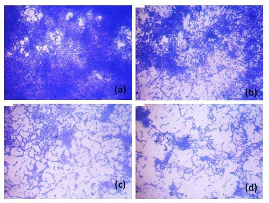 Light microscopy analysis showing the biofilm inhibitory potential of HANPs against P. aeruginosa ATCC 10145 at increasing concentrations. Control, treated with HANPs at 0 µg mL−1 (a); biofilm formed in the presence of HANPs at 10 µg mL−1 (b), 25 µg mL−1 (c), and 50 µg mL−1 (d).
