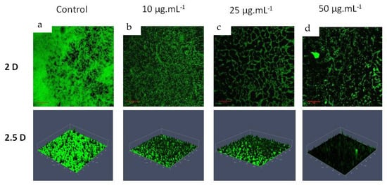 The effect of HANPs on the P. aeruginosa ATCC 10145 biofilm architecture according to the HANP concentrations was studied using a light microscope (Micros, Ansfelden, Austria) and a confocal laser scanning microscope (CLSM; LSM 710, Carl Zeiss, Jena, Germany). HANPs at various concentrations (10, 25, and 50 µg mL−1) were assessed for antibiofilm activity against P. aeruginosa. The pathogen was inoculated into a 24-well microtiter plate containing glass slides (1 × 1 cm) dipped in LB broth with and without HANPs. The pathogen was allowed to form the biofilm on the glass slides by incubating at 37 °C for 24 h. Following incubation, the glass slides were taken from the wells and washed with phosphate-buffered saline (PBS, pH 7.4) to remove the planktonic cells. For the light microscopic analysis, the glass slides were stained with crystal violet as described in Section 2.4.1, and the biofilm was observed under a light microscope at 400× (Micros, Austria) [].