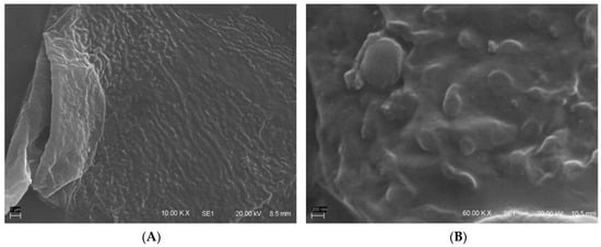 Scanning electron micrographs of 1 mg/mL KDP-loaded nanoemulsion (NERO1KDP) at (A) 10,000× and (B) 60,000× magnification.