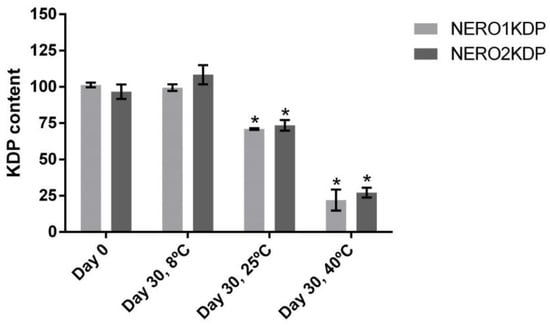 Kojic dipalmitate (KDP) content in 1 mg/mL (NERO1KDP) and 2 mg/mL (NERO2KDP) KDP-loaded nanoemulsions after 0 and 30 days of storage at 8, 25, and 40 °C. An asterisk indicates a significant difference between NERO1KDP or NERO2KDP and the same formulation on day 0 of storage (p ≤ 0.05).