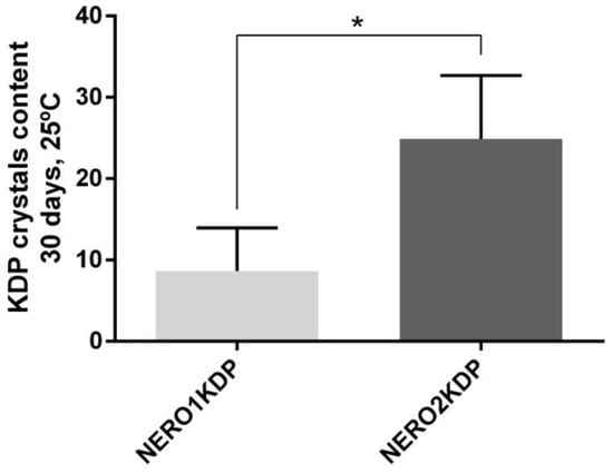 Considering the high lipophilicity of KDP, the formation of crystals was also investigated. Figure 3 shows KDP crystal formation after 30 days of storage at room temperature (25 °C). Approximately 10% and 25% KDP crystals were observed in NERO1KDP and NERO2KDP, respectively. NERO1KDP had a significantly lower (p ≤ 0.05) crystal content than NERO2KDP.