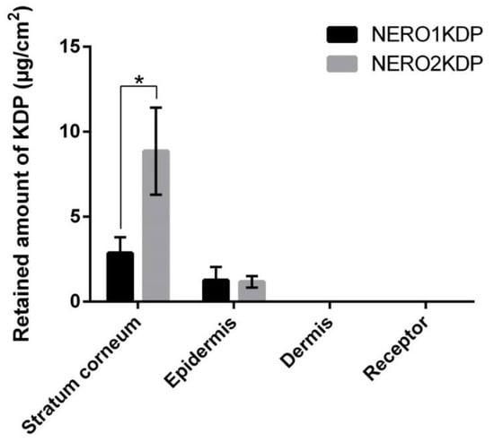 After the skin permeation study, KDP is mainly located in the stratum corneum because this is where the formulation is applied, and it is the main barrier of the skin. Although NERO2KDP application resulted in a larger amount of KDP retained in the stratum corneum, this did not reflect in a larger amount of the active ingredient in the epidermis. Approximately 1.2 µg/cm2 KDP was found in the epidermis with both NERO1KDP and NERO2KDP treatments, not differing from each other (p > 0.05). Given the lack of differences between the formulations, it would be more suitable to use the 1 mg/mL KDP formulation. The skin might have become saturated with KDP in both cases, explaining the lack of difference in epidermal permeation between treatments. According to Guyader et al. (2020) [41], an increase in drug concentration does not mean that an increase in skin penetration will occur, since a saturation of skin flow can happen. It was not possible to quantify the active ingredient in deeper layers of the skin.