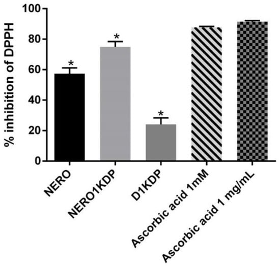 The DPPH assay, in which the DPPH radical is reduced by antioxidants, was performed to assess the antioxidant activity of the 1 mg/mL KDP nanoemulsion (NERO1KDP) and compare it with that of a 1 mg/mL KDP dispersion and ascorbic acid, a known antioxidant. Results are depicted in Figure 6 and expressed as a DPPH inhibition percentage. Ascorbic acid was used as a positive control at 1 mg/mL (same concentration as KDP in the dispersion and nanoemulsion) and 1 mM (corresponding to 0.17 mg/mL), resulting in a DPPH inhibition of 91.45% ± 0.75% and 87.50% ± 0.38%, respectively, not differing from each other (p > 0.05). Park et al. [42] also used ascorbic acid as a positive control and reported an inhibition of 94% at 0.1 mg/mL. This result is similar to the values observed here, although it was achieved with a lower concentration, suggesting that ascorbic acid activity may reach a plateau.