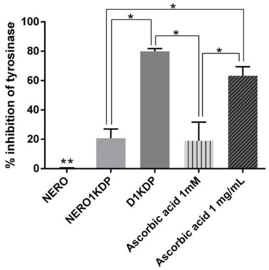 The tyrosinase inhibition assay was conducted as described by Lajis et al. and Berlitz et al., with modifications [25,26]. Briefly, 625 µL of 2 mM l-tyrosine diluted in phosphate buffer (0.1 M, pH 6.8), 313 µL of 0.1 M phosphate buffer (pH 6.8), and 250 µL of sample (NERO, NERO1KDP, or D1KDP) were added to Falcon tubes and incubated for 5 min at 37 °C. Then, 50 µL of phosphate buffer with or without tyrosinase (0.0625 mg/mL from 50 kU tyrosinase) were added to the tubes. After 15 min of incubation (37 °C), dopachrome concentration was determined by absorbance measurement (UV-2600 UV–VIS spectrophotometer, Shimadzu, Japan) at 405 nm. Ascorbic acid solutions (1 and 0.17 mg/mL) were used as positive controls, and phosphate buffer was used as a negative control. The experiment was performed in triplicate. Tyrosinase inhibition percentage was calculated using Equation (3):