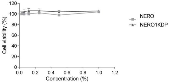 Fibroblast (3T3-L1) cell viability after 24 h of treatment with unloaded nanoemulsion (NERO) and 1 mg/mL kojic dipalmitate (KDP)-loaded nanoemulsion (NERO1KDP) at concentrations ranging from 0.06% to 1%. No significant differences (p > 0.05) were observed between samples.