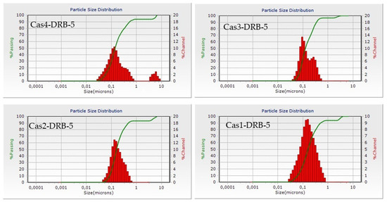 The median size of the obtained particles ranged from 127 nm to 167 nm (Table 2) indicating a clear tendency for size reduction with the decrease in polymer concentration. The histogram of batch Cas4-DRB-5 (Figure 4) displays a bimodal particle size distribution suggesting the presence of aggregates, as hypothesized from DL and EE determination. The zeta potential of the four batches ranged from −18.63 mV to −33.21 mV, indicating the formation of a stable colloid suspension (Table 2). The negative charges on the surface of the particles resulted from the net electrostatic charge at pH values above the isoelectric point (4.6), where the casein carboxylic groups become negatively charged [39].