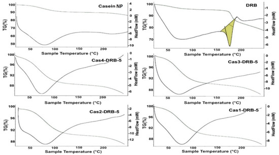 TG/DTA thermograms of blank casein nanoparticles and DRB−free and DRB−loaded casein nanoparticles of various batches.