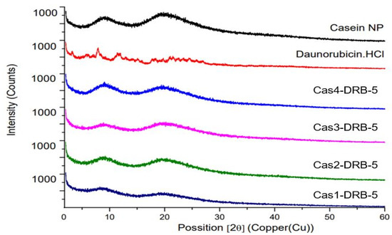 The results were confirmed by the XRD study (Figure 6). The XRD pattern of pure DRB showed several characteristic peaks in the 2θ region—3.18°, 7.89°, 11.42°, 21.28°, and 24.42°, resulting from its crystalline structure. These peaks were not observed in any of the batches of DRB-loaded casein nanoparticles. Moreover, the typical amorphous XRD pattern of casein was observed, indicating transformation of the drug from a crystalline to an amorphous state. Similar results have been reported after spectroscopic studies on the interaction of the γ-cyclodextrin–daunorubicin inclusion complex [42].