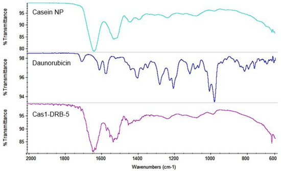 In the FTIR spectra of blank casein nanoparticles (Figure 7), two distinct peaks were found at 1646 cm−1 in the amide I region and 1530 cm−1 in the amide II region, corresponding to the stretching of the carbonyl group (C=O) and to the symmetric stretching of N-C=O bonds, respectively. The peak at 1077 cm−1 could be due to interactions of monocationic phosphates with Na+ while the band at 977 cm−1 corresponds to bionic phosphate, confirming interactions with Ca2+. Two characteristic peaks of DRB were observed in the spectrum of drug-loaded casein nanoparticles. The first peak is shown at 1616.48 cm−1 due to C=O stretching of hydrogen-bonded quinone carbonyl groups, and the second peak is at 1581.44 cm−1 and attributed to C=C stretching [43], indicating successful drug incorporation into the polymer matrix. In all of the batches of drug-loaded nanoparticles, no shifts in the characteristic peaks of DRB and casein were observed, indicating the absence of interactions between the molecules.