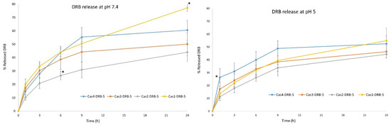 DRB release profiles from batches Cas4-DRB-5, Cas3-DRB-5, Cas2-DRB-5, and Cas1-DRB-5 at pH 7.4 and pH 5 (n = 6, *—statistically significant difference between models at the same time points, p < 0.01).