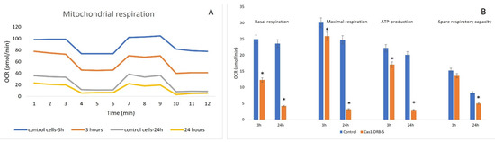 Treatment with batch Cas1-DRB-5 resulted in a statistically significant decrease in basal respiration (from 25 to 12.3 pmol/min on the 3rd and from 23.6 to 4.2 pmol/min on the 24th hour), maximal respiration (from 30.1 to 25.9 pmol/min on the 3rd and from 24.8 to 3.2 pmol/min on the 24th hour), and ATP production (from 22.2 pmol/min to 17.1 pmol/min on the 3rd and from 20.1 to 3.2 pmol/min after 24 h). The decrease in spare respiratory capacity from 15.2 to 13.6 pmol/min was not significant after 3 h of treatment but after 24 h, decreased levels from 8.2 pmol/min to 5 pmol/min were found (Figure 10B).