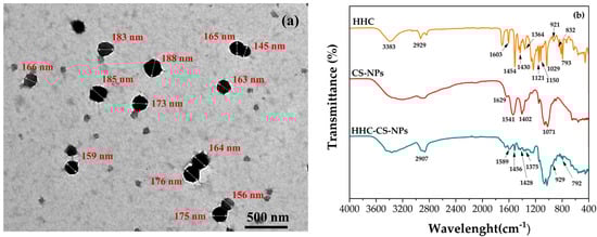 The particle size, zeta potential, and EE of the optimized HHC-CS-NP formulation are shown in Table 3, and the polydispersity index (PDI) is 0.43 ± 0.4. The PDI value is related to the size distribution of the NPs, which ranges from zero to 1. The values close to zero show homogeneous NPs, while a value above 0.5 indicates heterogeneous NPs [45,46]. The optimized HHC-CS-NPs show PDI values of less than 0.5, which are considered good particle size distributions. The results are in agreement with the study reported by Lino et al. [47]. The morphology of the optimized HHC-CS-NPs visualized by TEM shows that they are spherical in shape and have a solid and dense structure (Figure 2a). The particle size obtained from the ImageJ software was 181 ± 12 nm, indicating good particle size distribution. These results correlated well with the polydispersity index (PDI) value results obtained from the DLS analysis. In general, the lower PDI value (close to zero) has long been used as a criterion for indicating a formulation with perfectly uniform mono-dispersion. Rosyada et al. [45] and Avadi et al. [46] also suggested that a PDI value above 0.5 indicates heterogeneous NPs. Therefore, the optimized HHC-CS-NPs with the PDI value of 0.43 ± 0.4 could be considered good particle size distributions. The results were in agreement with the study reported by Lino et al. [47]. However, the particle size determined by TEM was smaller than that determined by DLS (256 ± 14 nm). This is because the TEM image was obtained from a dry sample under vacuum and provided the actual radius of the particles, whereas the DLS profile was taken in an aqueous solution [48,49]. Bao et al. [50] demonstrated that particles in the range of 50 to 200 nm with a spherical shape and a solid dense structure have the highest tendency for long circulation and exhibit efficient extravasation into leaky tumor vasculature and accumulation in tumor tissues through enhanced permeability and retention (EPR) effects. Thus, it might suggest that the developed NPs could be a good choice as an effective delivery system for cancer treatment. The FTIR spectra of the HHC, CS-NPs, and optimized HHC-CS-NPs are shown in Figure 2b. The characteristic peaks for pure HHC at 3338, 2929, and 1603 cm−1 correspond to O-H stretching, CH2 asymmetric stretching, and C=O stretching, respectively. The peaks at 1454, 1430, and 1364 cm−1 indicate C=C stretching, C-H bending, and CH3 bending, respectively. The peaks at 1150 and 1029 cm−1 are attributed to C-O-C stretching. The peak at 1121 cm−1 is referred to the C-O stretching [51]. The peaks at 792, 823, and 921 cm−1 indicate the bending vibrations of the -CH bond of the alkene group [52]. The FTIR spectrum of the CS-NPs has six characteristic peaks at 3197, 1629, 1625, and 1528 cm−1, which are attributed to the O-NH2 and –OH group stretching, an interaction between the NH+3 groups of CS and the phosphate groups of TPP, the CONH2 group, the NH2 group, and the P=O stretching from the phosphate groups, respectively [53]. The FT-IR spectra of the HHC-CS-NPs showed most of the characteristic peaks of HHC, with some broadening and reduced intensity, indicating that there was no chemical interaction between the HHC and CS-NPs and the presence of the drug as a molecular dispersion in the nanoparticle matrices via physical interaction. The prepared HHC-CS-NPs can maintain the integrity of the HHC structure without causing degradation [54].