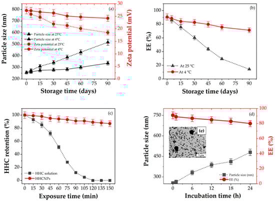 The stability against UV light of the HHC-CS-NPs and HHC with an HHC concentration equivalent to that of the HHC-CS-NPs was performed following the method described by Li et al. [24], with modifications. The samples were transferred into a clear glass bottle, placed into a light-proof cabinet, and exposed to a 254 nm UV lamp (model TUV 30 W/G30 T8, Philips, Hamburg, Germany) for different time periods (0–150 min) at 25 °C ± 0.5. The gap between the samples and the UV light sources was fixed at 30 cm. At pre-determined times, the samples were taken to evaluate the EE, as described above. The light stability of the samples was assessed by the HHC retention percentage, which can be calculated using Equation (2).