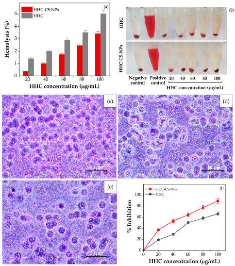 The in vitro anti-inflammatory activity of the HHC-CS-NPs and unencapsulated HHC was determined using a hemolysis assay, as previously described by Jiang et al. [34], with modifications. Briefly, sodium citrate-stabilized male Wistar rat (2 weeks’ age, 350–400 g weight) blood samples were collected and provided by the National Laboratory Animal Center of Mahidol University, Thailand. The animal research protocol was approved by the National Laboratory Animal Center Animal Care and Use Committee (NLAC-ACUC), National Laboratory Animal Center, Mahidol University, Thailand (approval code: RA2022-09; approval date: 28 January 2022). Whole blood was centrifuged at 3500× g rpm for 5 min to separate the packed erythrocytes (RBCs) from the plasma. To prepare the RBC suspension, 100 μL of packed RBCs were diluted with 0.9 mL PBS (pH 7.4) to prepare the RBC suspensions. The RBC suspensions were then individually mixed with 0.8 mL samples of the HHC-CS-NPs or HHC at an equivalent HHC concentration of 20–100 μg/mL. Then, 0.8 mL ultrapure water or PBS (pH 7.4) was added to 0.2 mL diluted RBC suspensions as the positive and negative control groups, respectively. All the samples were vortexed and incubated at 37 °C for 30 min before being centrifuged at 3500× g rpm for 5 min. Furthermore, 100 μL supernatant was collected and transferred to a 96-well plate, and the absorbance of hemoglobin was measured by a microplate reader at 577 nm. The hemolysis percentage was calculated according to Equation (8).