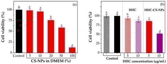 The non-toxicity dose of the CS-NPs compared with the control (p > 0.05) was selected for the cell viability assay of the HHC-CS-NPs or the unencapsulated HHC in further experiments.