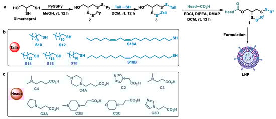 Construction of disulfide lipids library. (a) Synthetic route for the preparation of disulfide lipids. (b) Hydrophobic tails used in the lipids. (c) Hydrophilic heads used in the lipids. The heads and the tails were termed as C and S, and the numbers behind them refer to the number of carbons.