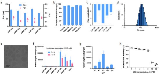 Optimization and characterization of LNPs prepared from leading lipids loaded with Fluc−mRNA. (a) Size (nm) and PDI of Luc−mRNA LNPs. (b) Zeta potential of Luc−mRNA LNPs. (c) Encapsulation efficiency (EE) of different LNPs loaded with Fluc−mRNA. (d) Size distribution by the intensity of C4S18A-derived LNP. (e) Cryo-electron microscopy of C4S18A LNP. (f) Luciferase expression following treatment of 293T cells with Fluc−mRNA LNPs. (g) Optimization of N/P ratio using the best C4S18A LNPs. (h) EE change over the concentration of GSH (from 0 to 32 × 10−3 M). Data presented as mean ± SEM of 3 separate samples or experiments.