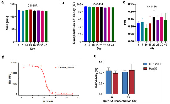 According to the above data, we can see LNPs originated from C4S18A characterized by appropriate physicochemical properties and relatively high expression efficiency. Thus, LNPs from C4S18A were determined for more tests. Firstly, the stability of these two LNPs was explored by recording the size, PDI and EE over time when storing the samples at 4 °C. No significant change in size and EE was observed (Figure 4a,b). Although the PDI rises slightly over time, it keeps below 0.2, even after 40 days (Figure 4c). Next, we measured the apparent pKa of C4S18A LNPs using the fluorescence intensity of 2-(p-toluidino)-6-naphthalene sulfonic acid (TNS). The pKa of LNP is an important parameter for the cationic lipid and most of the efficient cationic lipids are characterized by apparent pKa values between 6 and 7 [29]. The pKa of C4S18A LNPs was determined to be 6.17 by a curve fit (Figure 4d). Moreover, we surveyed the toxicity of LNPs to cells and cell counting kit−8 (CCK8) assays were performed in 293T and HepG2 cells (Figure 4e). Cells were incubated with LNPs at a high concentration of 16 and 32 uM. We did not observe any toxicity, and cell viability was always more than 90%, compared to the PBS blank control, which confirmed the good biocompatibility and safety of our lipids.