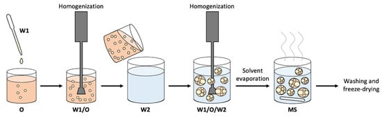 Exemplary scheme of the double-emulsion technique (W1/O/W2) used for the microsphere development.