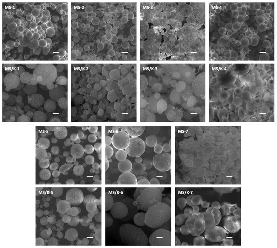 Representative SEM images of empty MSs and MS/Ks showing a spherical morphology. Scale bar: 20 μm. Magnification: 1000×.
