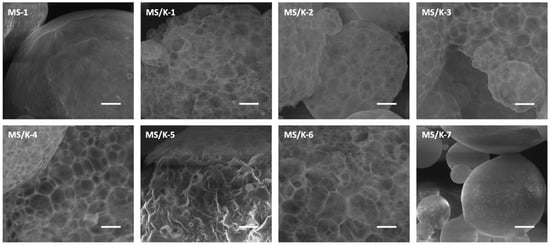 Effect of synthesis parameters on MS surface characteristics. Scale bar: 5 μm; magnification: 7000×.
