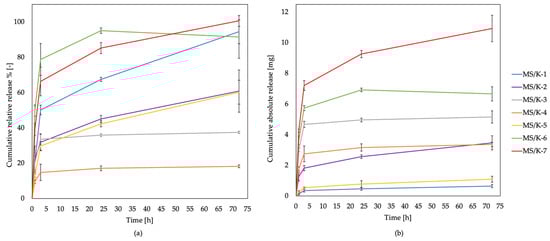 Cumulative relative (a) and absolute (b) release profiles of LYS from MS/K upon incubation in PBS at 37 °C for 72 h. LYS cumulative release was expressed as the released relative percentage of the total amount of encapsulated LYS or as the absolute weight of LYS released for each sample type. Reported values represent the mean ± SD (n = 6).