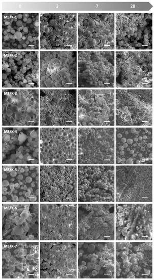 Degradation resistance of MS/Ks in a physiological-like environment (PBS 1X, pH 7.4, 37 °C) up to 28 days as observed via SEM. Scale bar: 50 µm; magnification: 500×.