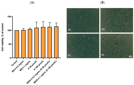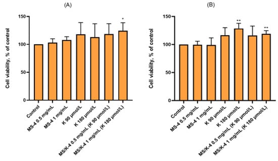 As shown in Figure 8, the addition of the MS/K-4 or MS-4 to confluent endothelial cells for 24 h had no effect on the cell viability and/or metabolic activity, which indicated the complete biocompatibility of the proposed formulations.