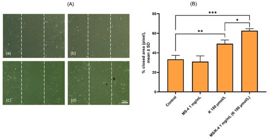 The migration of HMEC-1 was assessed using a wound-healing assay [48]. The HMEC-1 was seeded in 6-well plates and grown to confluence. After reaching confluence, the monolayers were scratched with a sterile 200 μL pipette tip, washed twice, and incubated for 24 h in serum-depleted media in the presence or absence of free LYS (90 and 180 µmol/L), MS-4 (0.5 and 1 mg/mL), and MS/K-4 (0.5 and 1 mg/mL). After 24 h, cell migration into the denuded area was photographed under a phase-contrast microscope (10× objective) that was connected to a digital camera (EVOS XL Core Imaging System, Thermo Fisher Scientific, Waltham, MA, USA). The resulting images were analyzed using ImageJ software optimized with specific plugins for automatic detection of the scratched area [49]. The cell-empty area was measured, and treatments were compared. An increase in the cell-filled area indicated cell migration.