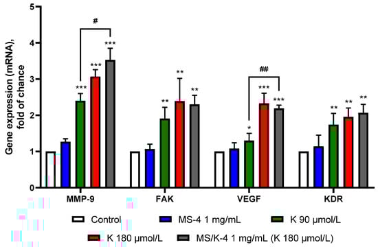 MS/K-4 induced the expression of pro-angiogenic genes in human endothelial cells. HMEC-1 was treated with MS/K4, free LYS, or MS-4 for 24 h at the concentrations indicated. The total RNA was then extracted from cells, and the mRNA levels of MMP-9, FAK, VEGF, and KDR were measured via qPCR using specific primers and normalized to GAPDH RNA. Data (means ± S.D.; n = 3) were expressed as fold induction over the basal (untreated) control. * p < 0.05 versus basal (untreated) control; ** p < 0.01 vs. basal (untreated) control; *** p < 0.001 vs. basal (untreated) control; # p < 0.05 between joined bars; ## p < 0.01 between joined bars.
