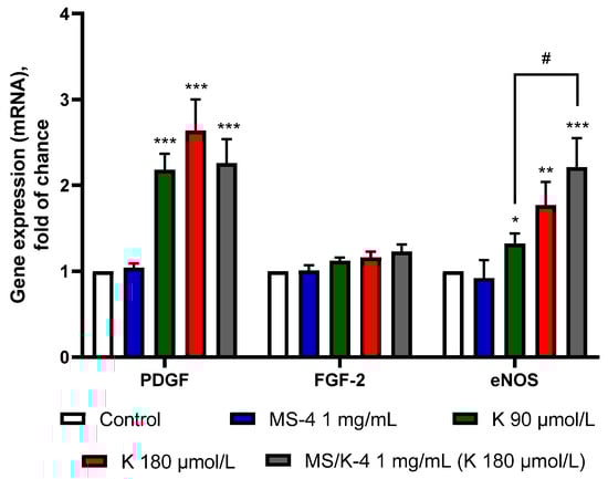 Finally, we examined the effects of the MS/K-4 on the mRNA expression of PDGF and FGF-2, two growth factors that are known for their characteristic synergistic activity in stimulating angiogenic vascular growth [59] and in the gene expression of eNOS. As shown in Figure 12, the MS/K-4 was able to increase the expression of PDGF and eNOS, whereas the expression of FGF was not affected. Despite the lower release of LYS from the encapsulated formulation, we observed significantly higher activity for the MS/K-4 in terms of eNOS gene induction (p < 0.001 between the MS/K-4 compared with LYS at 90 µmol/L), which indicated an enhancement of the LYS activity under controlled release conditions.