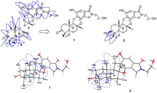 Key HMBC (blue arrows), COSY (red bonds) and NOESY (blue dashed arrows) correlations leading to the structural elucidations of memnobotrins C (1) and D (2).