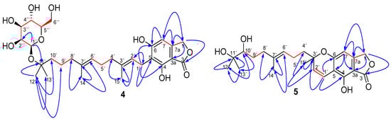 Key HMBC (blue arrows) and COSY (red bonds) correlations leading to the structural elucidations of 4 and 5.