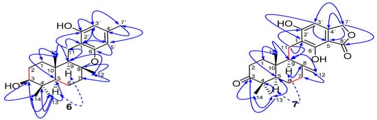 Key HMBC (blue arrows), COSY (red bonds) and NOESY (blue dashed arrows) correlations leading to the structural elucidations of 6 and 7.
