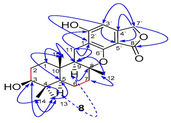 In the case of compound 7, the presence of a protonated adduct ([M+H]+ ion) at m/z 385.2014 in its (+)-ESI-TOF MS data (calcd. for C23H29O5, 385.2010) agreed with a molecular formula of C23H28O5 for the compound. The NMR data of this compound showed a total of twenty-three carbons with many similarities to compound 6 (Table 4), including six sp2 aromatic carbons at δC 117.0, 165.6, 101.9, 103.3, 148.2, and 156.6 (C1′–C6′). However, two additional olefinic carbons at δC 149.5 (C8) and 108.4 (C12) and two carbonyl carbons at δC 219.0 (C3) and 174.7 (C8′) were identified in the NMR data of compound 7. In all, these accounted for seven degrees of unsaturation, which, when compared to the molecular formula of C23H28O5, suggests the presence of three cycles in addition to the aromatic ring. Three singlet methyl hydrogen signals were present in this compound, and from these, the following HMBC cross-peaks were observed: δH 1.04 (H13) to carbons δC 26.5 (C14), 48.8 (C4), 56.9 (C5), and C3 (ketone); δH 1.07 (H14) to carbons δC 22.2 (C13), C4, C5, and C3; and δH 1.01 (H15) to carbons δC 38.4 (C1), 41.0 (C10), C5, and 54.4 (C9). These HMBCs defined a drimane-like substructure (with a C3 ketone) for compound 7. Further, HMBC cross-peaks from the two low-field olefinic hydrogens at δH 5.11 and 4.73 (H12) to the carbons at δC 39.2 (C7) and C9, together with HMBC cross-peaks from hydrogens H7, H9 and H11 all to carbon C8, placed a double bond between carbons C8 and C12, thus breaking the C8-O-C6′ bridge and opening up the pyran ring previously observed at this position in compound 6 (Figure 4). Additionally, HMBC cross-peaks similar to those previously described in compounds 4 and 5 established the same substructure for the isobenzofuranone part of compound 7 (C1′ to C8′). The NOESY and COSY correlations observed between hydrogens H3′ and H7′ corroborated the carbonyl position at C8′, thus completing the proposed structure of compound 7 (Figure 4). NOESY correlations around the drimane substructure confirmed the same stereochemistry in both compounds 6 and 7.