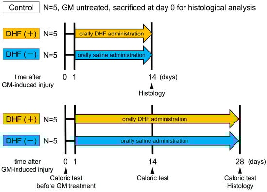 The GM-treated animals were divided into four groups. The DHF (+) group received daily oral administration of DHF (D1916, Tokyo Chemical Industry Co., Japan) at 19:00 for 2 weeks from day 1–14 or 4 weeks from day 1–28 after GM–induced injury (n = 5, each). The dose of DHF (5 mg/kg/day) in this experiment was determined according to a previous paper that showed this dosage was effective when used in vivo [34]. DHF (−) group received oral saline at 19:00 for 2 weeks from day 1–14 or 4 weeks from day 1–28 after GM–induced injury (n = 5, each).