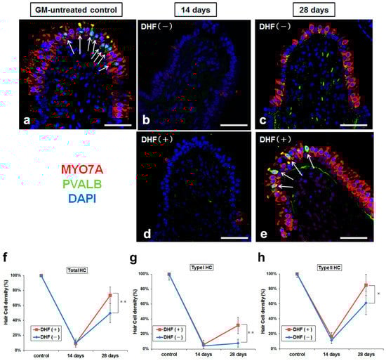 Changes in HC densities. (a–e) Confocal images of crista ampullaris stained with MYO7A antibody (red), PVALB antibody (green), and DAPI (blue). (a) GM-untreated control shows abundant HCs in the sensory epithelium and many type I HCs, double-stained with MYO7A and PVALB (arrow). (b,d) The HCs are remarkably decreased in both DHF (−) and DHF (+) groups 14 days after GM treatment. (c,e) The HCs are recovered in both groups 28 days after GM treatment. There are some type I HCs in DHF (+) group. (f–h) Changes in the densities of total HCs, type I HCs, and type II HCs after GM treatment with/without orally administered DHF (N = 5 for control, DHF (+) and DHF (−) at 14 and 28 days). Type I HCs almost disappeared in both groups 14 days after GM treatment, whereas type Ⅱ HCs decreased in both groups. Both types I and II HCs are significantly increased in the DHF (+) group than in the DHF (−) group. Scale bar (a–e), 50 µm; DAPI, 4′, 6-diamino-2-phenylindole; DHF, 7, 8–Dihydroxyflavone; GM, gentamicin; HC, hair cell; MYO7A, myosin 7a; PVALB, parvalbumin; ** p < 0.01; * p < 0.05 (Mann-Whitney U test).