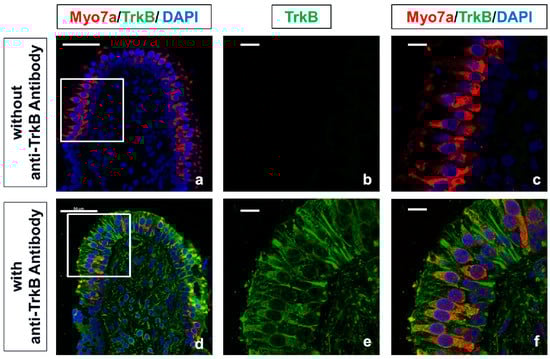 Confirmation of the TrkB receptor expression in crista ampullaris. (a–c) Upper panels are negative controls immunostained without the anti–TrkB antibody. (d–f) Lower panels show immunostaining with anti-TrkB antibody. Each middle and right panel (b,c,e,f) magnifies the boxed area in the respective left panel (a,d). Red represents MYO7A–labeled HCs, green represents TrkB receptors, and blue represents DAPI-labeled nuclei of cells. Expression of the TrkB receptor is confirmed in the cytoplasm of HCs and the peripheral region of the ampullary nerves. Scale bars (a,d), 50 µm; (b,c,e,f), 10 µm; DAPI, 4′, 6-diamino-2-phenylindole; HC, hair cell; MYO7A, myosin 7a; TrkB, tropomyosin–receptor–kinase B.