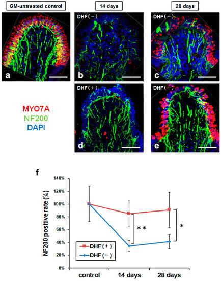 Quantitatively, we compared the rate of the NF200–positive regions of each group with that of the GM–untreated controls using three-dimensional images provided by Z–stack photography. NF200–positive rates in the DHF (+) group were significantly higher than those in the DHF (−) group at both 14 and 28 days after GM treatment (Figure 4f; p < 0.01 and p < 0.05, respectively). However, NF200–positive rates did not change from 14–days after GM treatment in either group. These results suggest that DHF effectively protects the ampullary nerves from GM-induced damage but does not enhance their recovery.