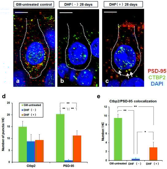 To examine whether DHF administration also influences synaptic remodeling after GM-induced injury, we labeled vestibular cristae with antibodies against CTBP2, a marker of presynaptic ribbons in HCs, and PSD–95, a marker of postsynaptic densities, in peripheral ampullary nerve endings. In GM-untreated controls, many PSD-95-positive and CTBP2–positive puncta were observed in HCs (Figure 5a). PSD-95 positive puncta were rarely observed in the HCs 28 days after GM-induced injury in the DHF (−) group; however, some CTBP2 positive puncta were observed (Figure 5b). Furthermore, many PSD-95-positive puncta and CTBP2-positive puncta were observed in HCs 28 days after GM-induced injury in the DHF (+) group (Figure 5c); colocalization of CTBP2 and PSD–95 was also observed.