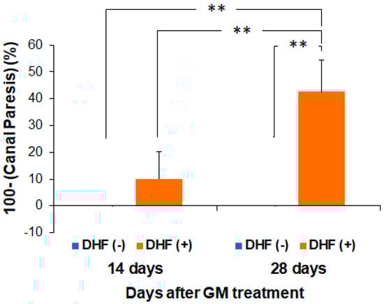 Finally, to examine whether DHF can promote the recovery of vestibular function, we performed caloric testing in both ears 14 and 28 days after GM–induced injury. Before GM injection, there were no significant differences in the duration of caloric nystagmus between the DHF (+) and DHF (−) groups. No nystagmus was observed in the DHF (−) group 14 days after GM–induced injury; however, weak nystagmus was elicited in the DHF (+) group. While the extent of canal paresis was not significantly different between groups, the DHF (−) group still showed no nystagmus 28 days after GM injury; however, stronger nystagmus was elicited in the DHF (+) group. Furthermore, the canal paresis was significantly reduced (p < 0.01) from 14 to 28 days after GM treatment in the DHF (+) group and was significantly smaller in the DHF (+) group than in the DHF (−) group 28 days after GM treatment (p < 0.01, Figure 6). These results suggest that oral administration of DHF induces a functional recovery of the peripheral vestibular system, which corresponds well with the histological findings, including the enhanced regeneration of the HCs, protection of the ampullary nerves, and promotion of their synapses.