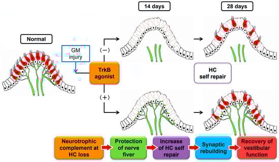 In conclusion, the promoted HC regeneration, vestibular nerve preservation, and synaptic remodeling induced by oral administration of DHF are considered to result in the recovery of vestibular function after GM treatment (Figure 7). While further studies are required to investigate the activity of the BDNF–TrkB pathway with/without DHF after GM-induced vestibular injury, this study’s results are an important and logical starting point for the effective treatment of vestibular diseases.