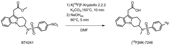 The binding of GPR44 by endogenous prostaglandin D2 has been posited to inhibit insulin secretion via the activation of the Gαi/o subunit of GPR44 with a negative impact on cAMP production []. However, the oral administration of a GPR44 inhibitor showed no major impact on insulin secretion in patients with type 2 diabetes, but has demonstrated an improvement in islet function under inflammatory and hyperglycemic stress []. MK-7246 is a GPR44 antagonist with high affinity and good pharmacokinetic properties, originally developed to treat respiratory diseases []. Recently, we have developed [11C]MK-7246 as a potential PET tracer for the in vivo visualization of the BCM. [11C]MK-7246 displayed favorable biodistribution properties and in vivo specific binding to GPR44 within the pancreas [,]. Despite the attractive nature of carbon-11 as a radionuclide, the presence of a fluorine atom in the MK-7246 molecule warrants the development and evaluation of the fluorine-18-labeled isotopologue without influencing its kinetic properties. Fluorine-18 (t½ = 109.7 min, 0.633 MeV) can potentially provide a better imaging resolution due to the lower positron energy compared to carbon-11 (t½ = 20.4 min, 0.960 MeV) and superior clinical potential due to the longer half-life and simplified logistics. Herein, we describe the design and synthesis of [18F]MK-7246 and its preclinical evaluation as a novel in vivo marker for GPR44 and BCM. Notably, our novel synthetic strategy allows for access to both [11C]MK-7246 and [18F]MK-7246 from a common advanced intermediate, making the overall approach divergent and highly attractive.