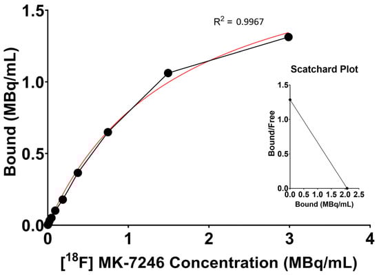Representative saturation binding curve and Scatchard plot calculated from the binding of [18F]MK-7246 to GPR44-expressing cells using the one-site-specific-binding-nonlinear-fit function of Graphpad Prism (average value of n = 15).