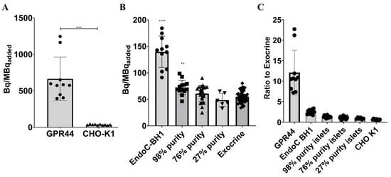 (A) Binding signal of [18F]-MK7246 to CHO-K1 cells expressing GPR44 (n = 10) were significantly higher compared with non-transfected CHO-K1 cells (n = 10) (**** p < 0.0001), (B) Binding signal of [18F]-MK7246 to EndoC-BH1 (n = 11) and human pancreatic fractions of various purity 98% purity (n = 13) were significantly higher than the exocrine fraction (n = 46) (**** p < 0.0001 and ** p < 0.001 respectively). Neither the 76% (n = 22) or the 27% (n = 6) showed any significant binding of [18F]MK-7246 compared to the exocrine pancreas tissue). (C) Uptake ratio to human exocrine fraction of [18F]-MK7246.